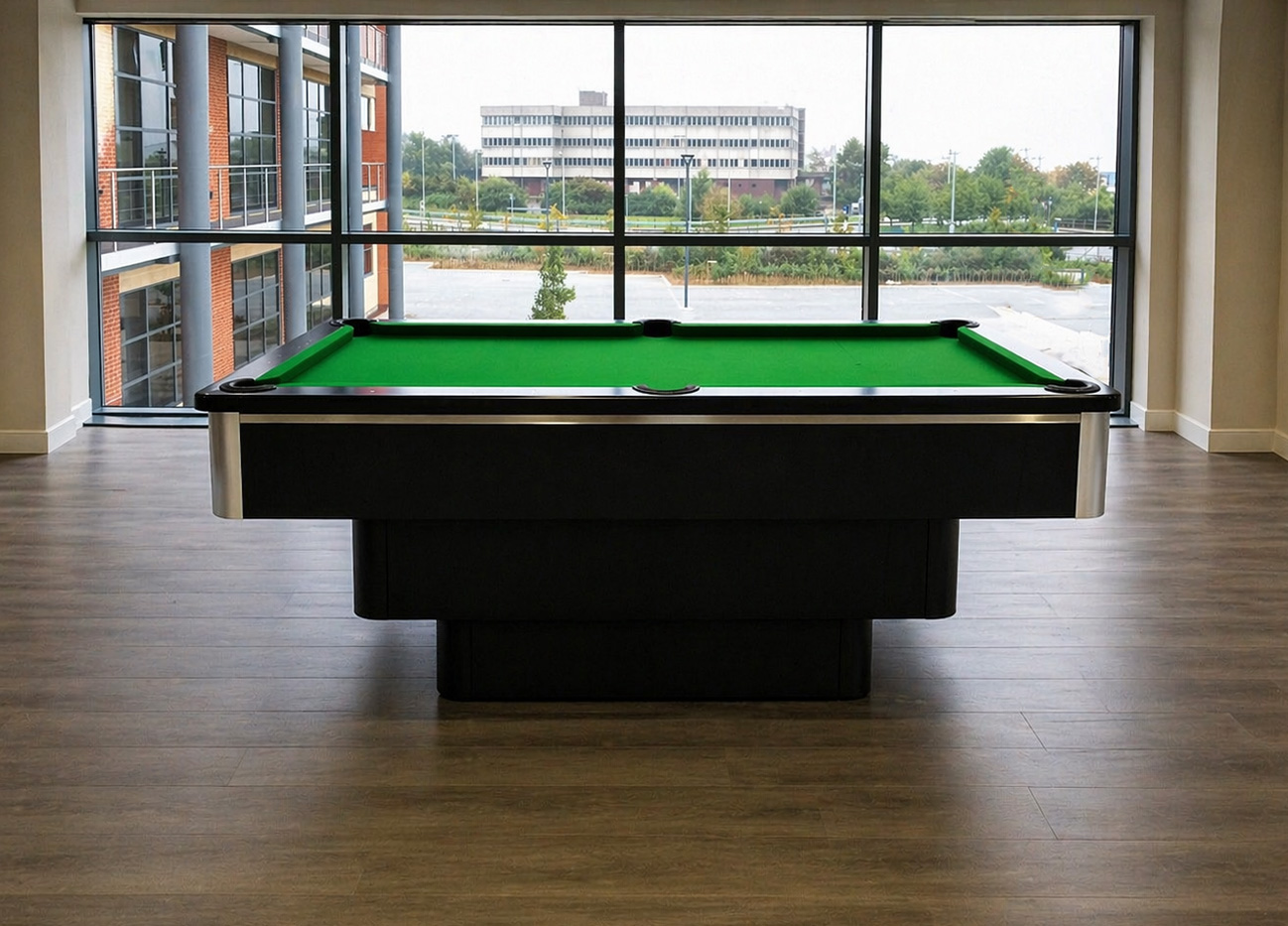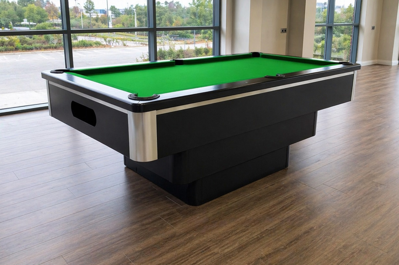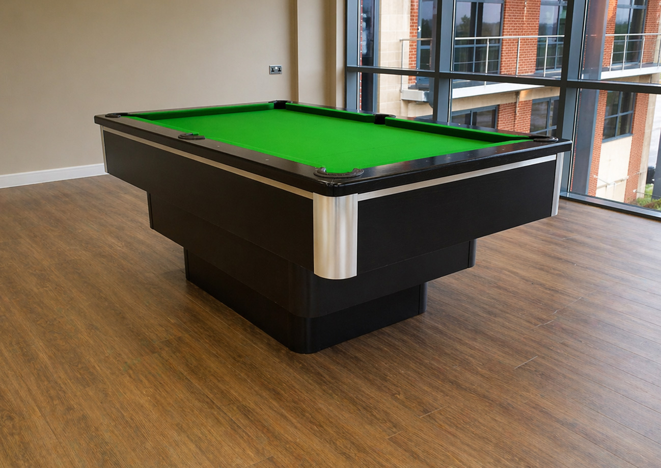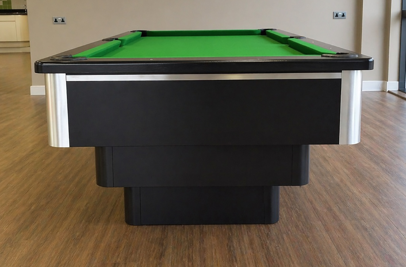 Our stunning contemporary English pool table with tiered base and traditional olive green cloth, coupled with black spray painted finish and black leather pockets to match, will leave a striking impression on your guests. You may even choose to find an alternative cloth colour for this style of tiered contemporary English pool table in an accent colour to suit your own interior decor.