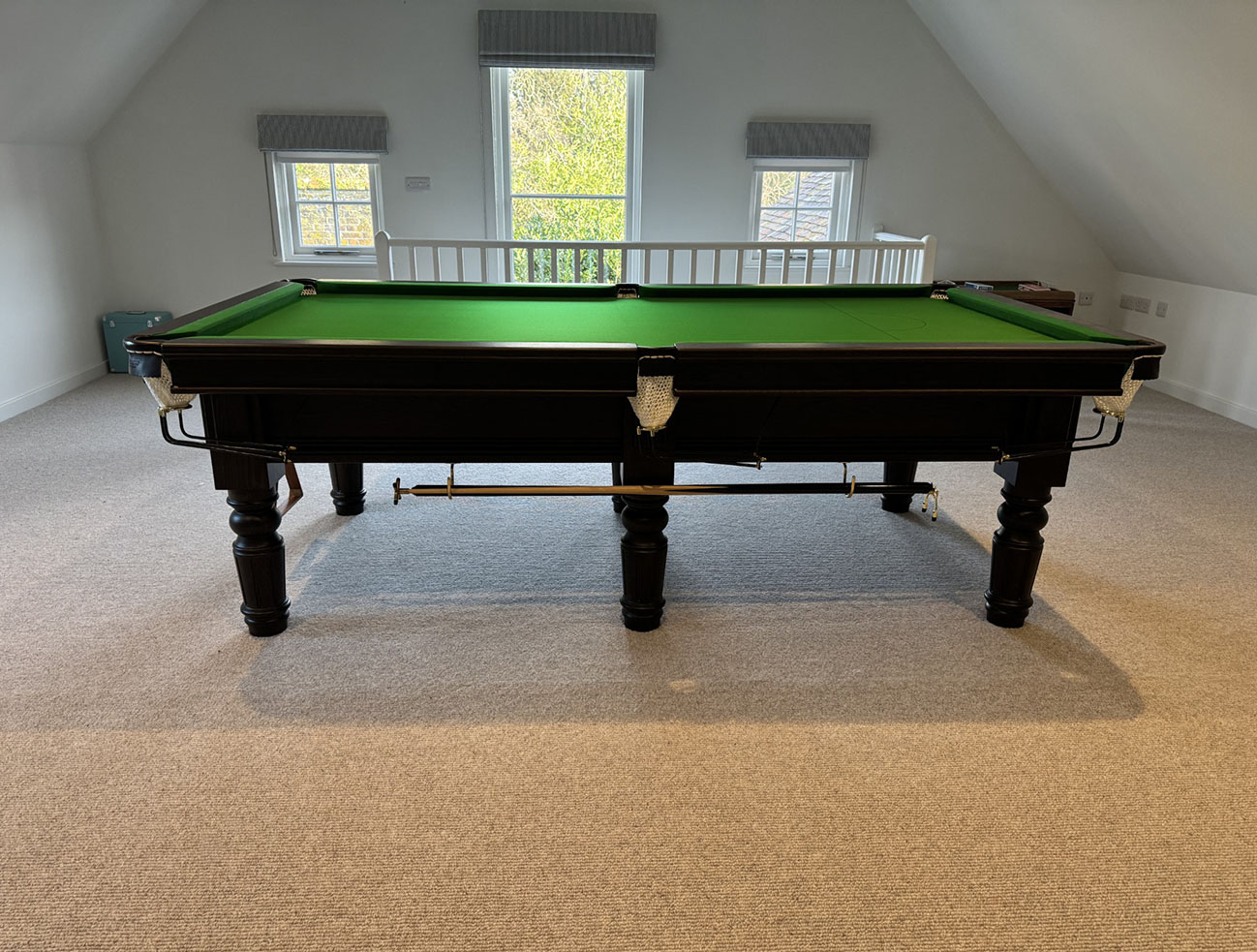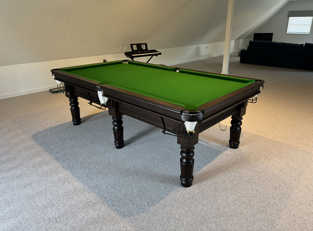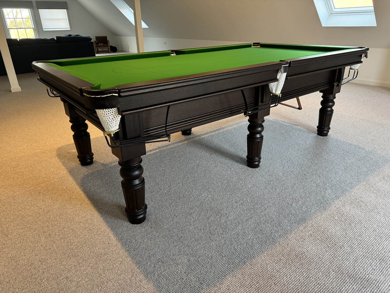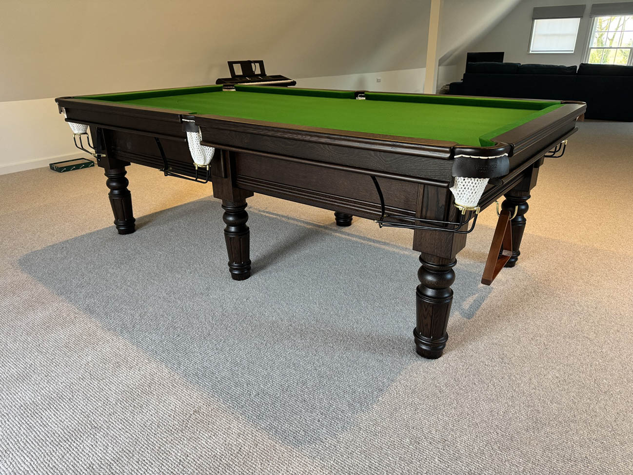 8ft Royal Executive Snooker Table manufactured in European oak (dark oak matt finish) with sectional slate and 6 straight turned fluted legs